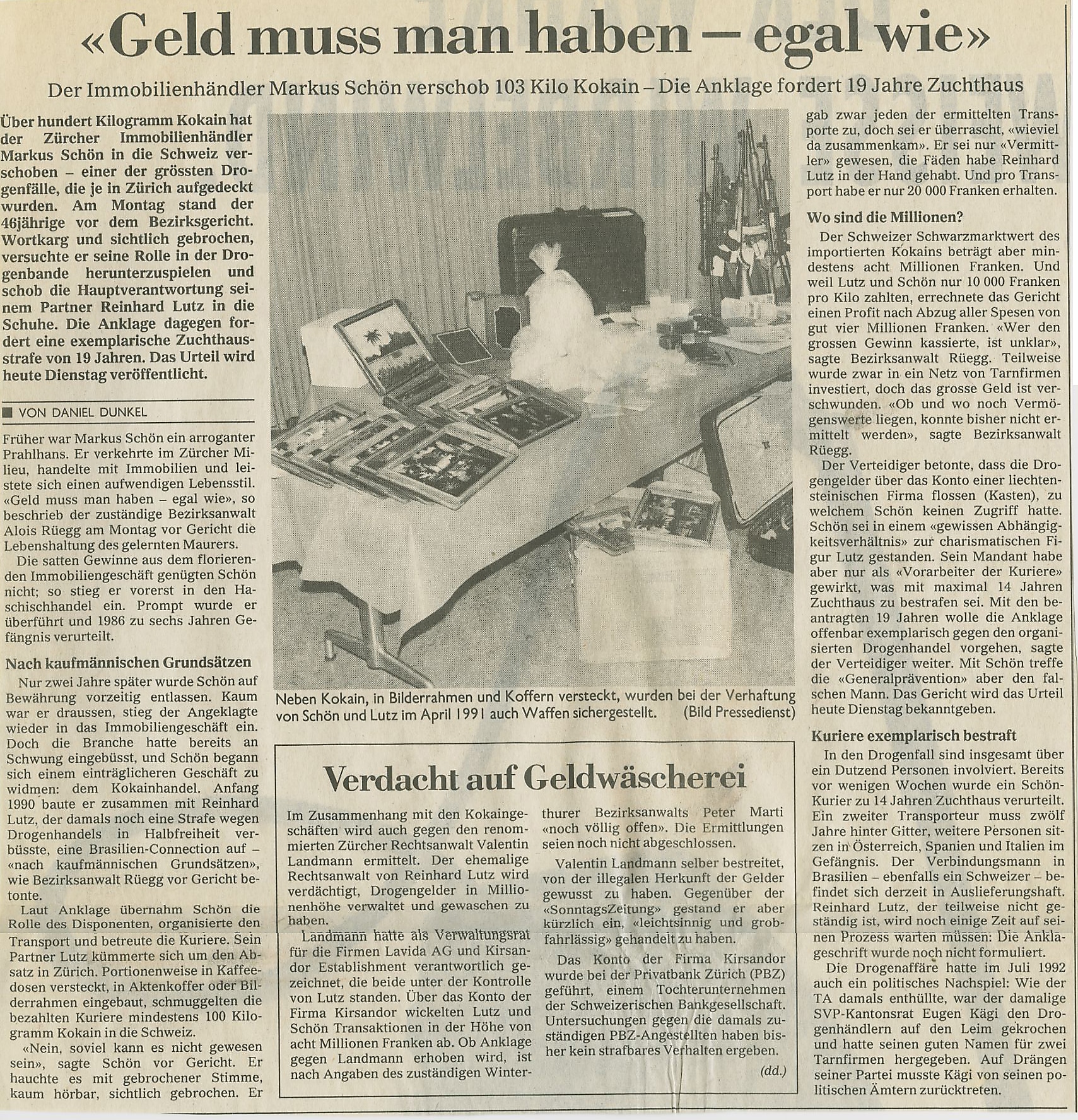 Über hundert Kilogramm Kokain hat der Zürcher Immobilienhändler Markus Schön in die Schweiz verschoben – einer der grössten Drogenfälle, die je in Zürich aufgedeckt wurden. Am Montag stand der 46jährige vor dem Bezirksgericht. Wortkarg und sichtlich gebrochen, versuchte er seine Rolle in der Drogenbande herunterzuspielen und schob die Hauptverantwortung seinem Partner Reinhard Lutz in die Schuhe. Die Anklage dagegen fordert eine exemplarische Zuchthausstrafe von 19 Jahren. Das Urteil wird heute Dienstag veröffentlicht.