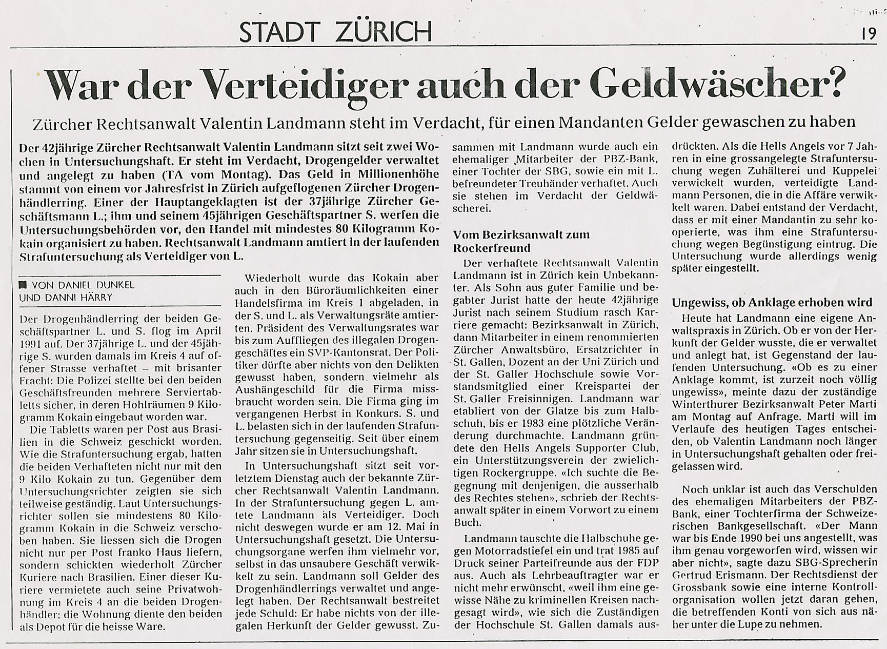 Der 42jährige Zürcher Rechtsanwalt Valentin Landmann sitzt seit zwei Wochen in Untersuchungshaft. Er steht im Verdacht, Drogengelder verwaltet und angelegt zu haben (TA vom Montag). Das Geld in Millionenhöhe stammt von einem vor Jahresfrist in Zürich aufgeflogenen Zürcher Drogenhändlerring. Einer der Hauptankgeklagten ist der 37 jährige Zürcher Geschäftsmann L.; ihm und seinem 45jährigen Geschäftspartner S. werfen die Untersuchungsbehörden vor, den Handel mit mindestens 80 Kilogramm Kokain organisiert zu haben. Rechtsanwalt Landmann amtiert in der laufenden Strafuntersuchung als Verteidiger von L.